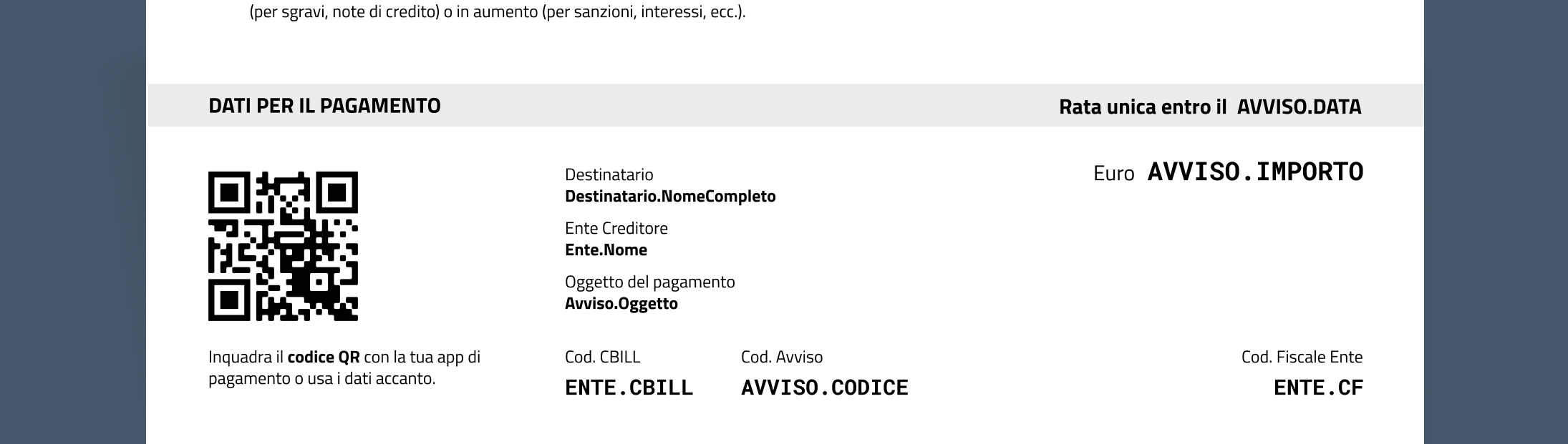 Se l'Ente Creditore dispone di un conto corrente postale per gli incassi, è necessario includere, subito dopo questa porzione, anche il Bollettino Postale PA.