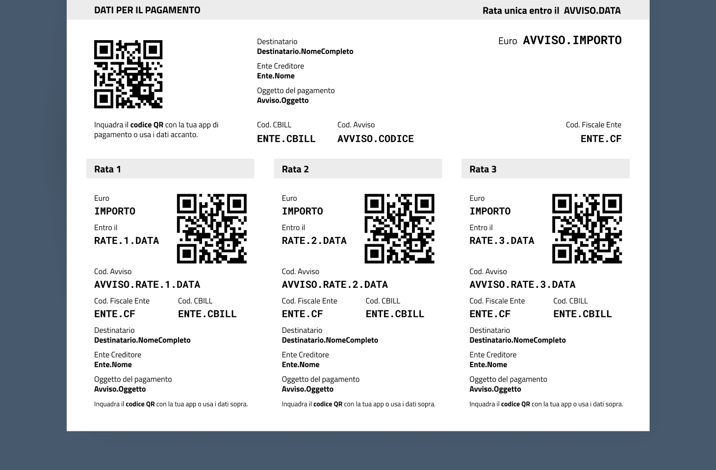 Questo modello raggruppa le rate per 2 o per 3, in modo che sia sempre possibile realizzare un avviso per qualsiasi frazionamento del pagamento, minimizzando il numero di pagine.
