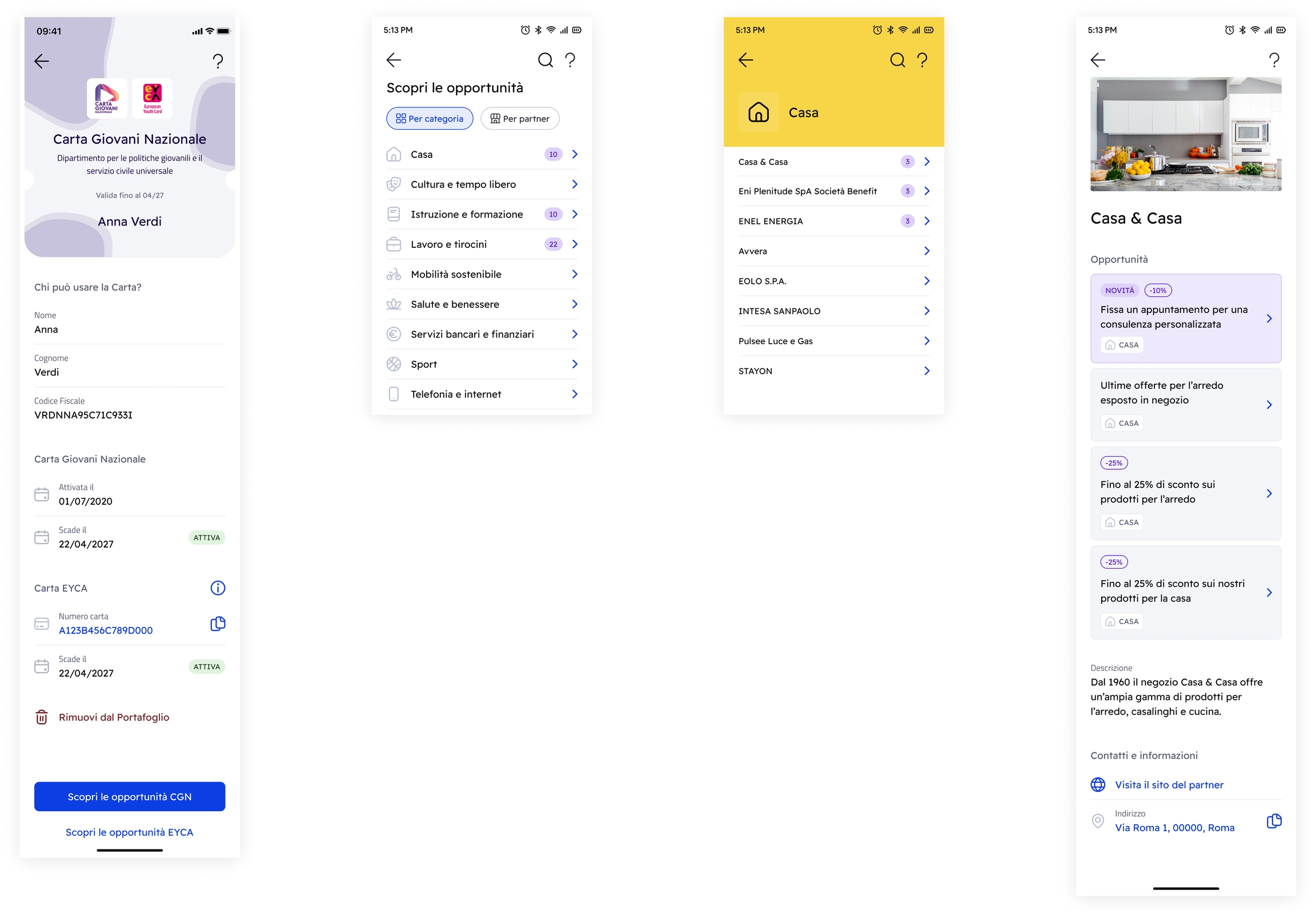 Il giovane beneficiario della CGN, che intende accedere alla lista delle opportunità accede alla sezione CGN della App IO, tocca "Scopri le opportunità" e atterra su una schermata di presentazione delle categorie merceologiche delle opportunità offerte dai partner (Operatori) dell'iniziativa (tab "Per categoria")