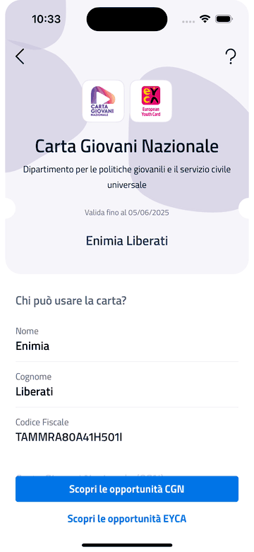 A differenza di quanto avviene per la carta EYCA, la CGN in App IO **non espone un identificativo univoco** e **non è** al momento **rilasciata in versione fisica**.