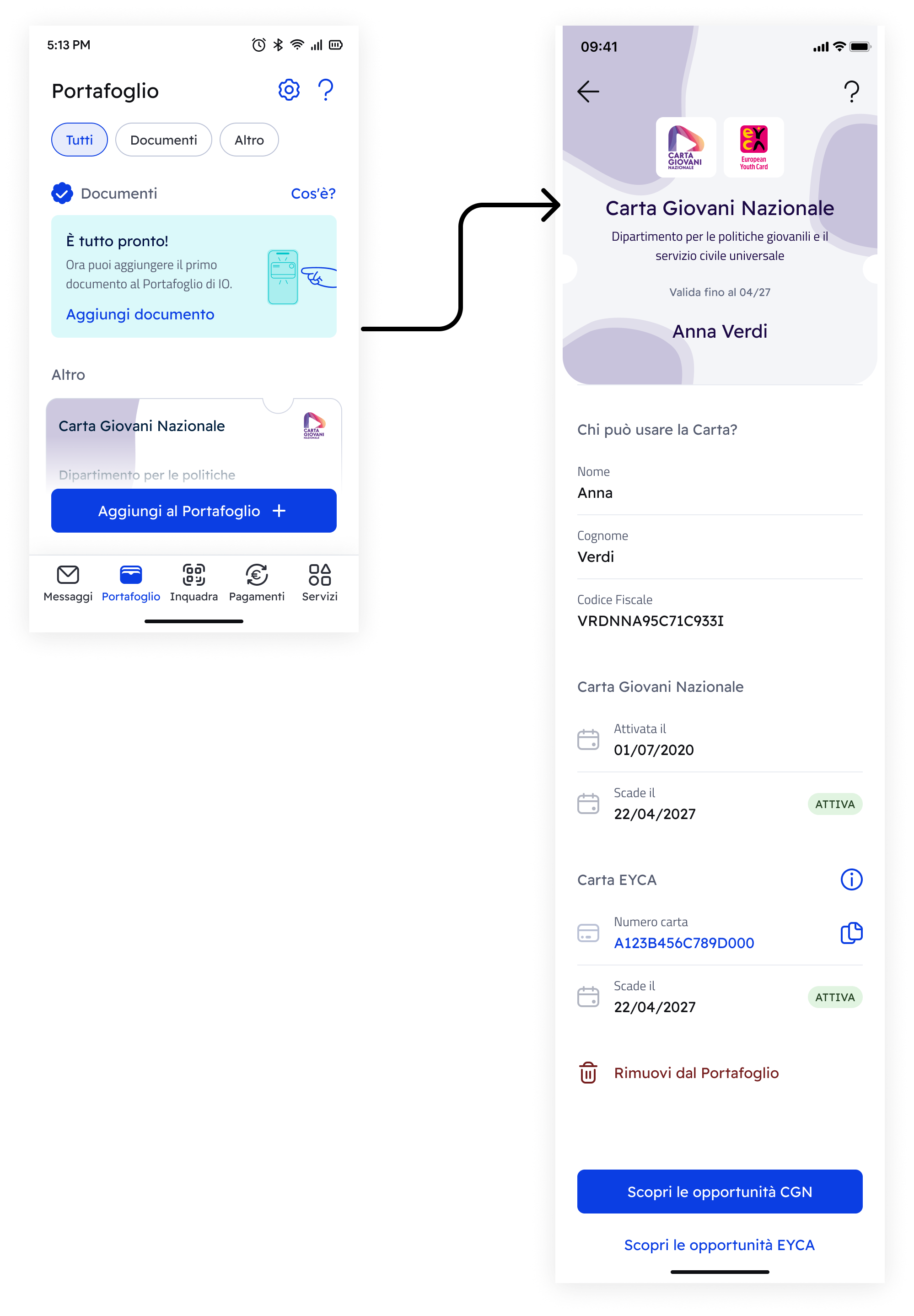 <figure><img src="https://2972627944-files.gitbook.io/~/files/v0/b/gitbook-x-prod.appspot.com/o/spaces%2FGVxSS3zVSEuRbwiMGCGx%2Fuploads%2Fgit-blob-6c610e9373860d7e580b0f6fec499d94caa3e720%2Fimage.png?alt=media" alt=""><figcaption><p><mark style="color:purple;">La sezione Portafoglio e il dettaglio della Carta Giovani Nazionale in App IO</mark></p></figcaption></figure>