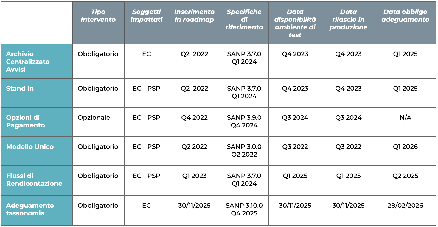 <table data-header-hidden><thead><tr><th width="176.17117945372053"></th><th></th></tr></thead><tbody><tr><td>Tipo intervento</td><td><strong>Obbligatorio</strong></td></tr><tr><td>Soggetti impattati</td><td><strong>PSP, EC</strong></td></tr><tr><td>Obiettivo</td><td><strong>Miglioramento Qualità</strong></td></tr><tr><td>Inserimento in Roadmap</td><td><strong>Q1 2023</strong></td></tr><tr><td>Specifiche di riferimento</td><td><strong>SANP</strong> <strong>3.7.0 - Q1 2024</strong></td></tr><tr><td>Data disponibilità ambiente Test</td><td><strong>Q4 2023</strong></td></tr><tr><td>Data rilascio in ambiente di produzione</td><td><strong>Q1 2025</strong></td></tr><tr><td>Data obbligo adeguamento</td><td><strong>Q2 2025</strong></td></tr></tbody></table>