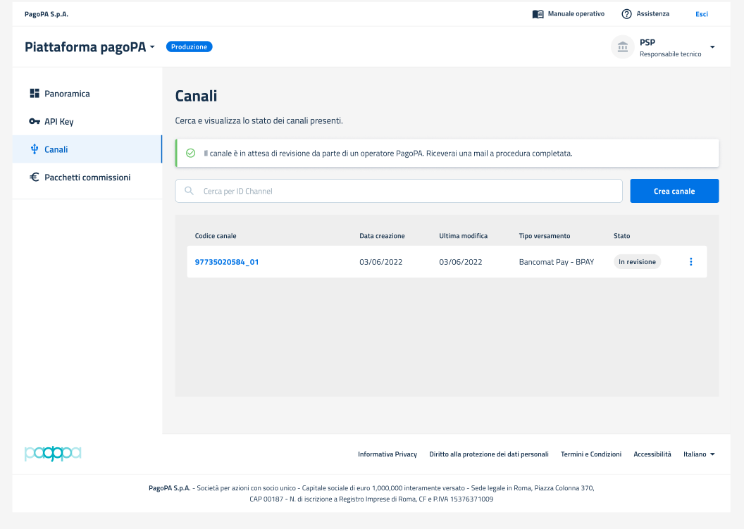 Una volta aver cliccato su tasto "Invia", l'utente verrà reindirizzato alla *Pagina Vista Canale* in cui potrà visualizzare nella tabella il canale, che risulterà nello stato **In revisione** (il canale è stato creato, ma in attesa di revisione da parte di PagoPA).