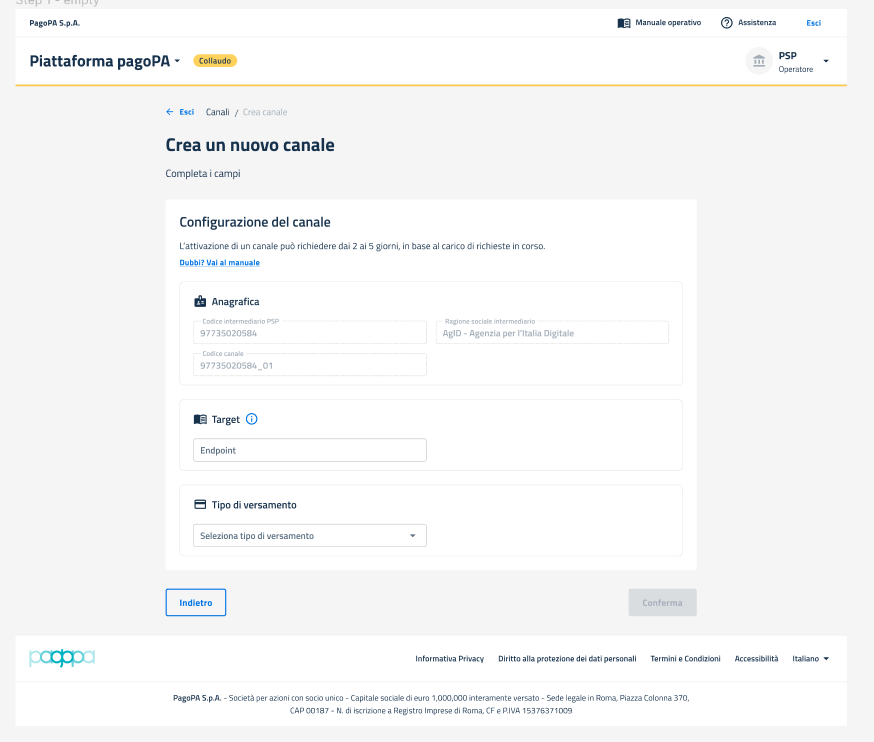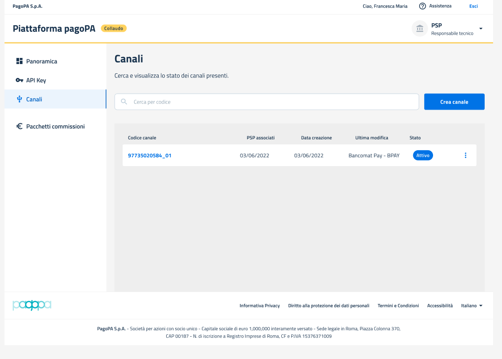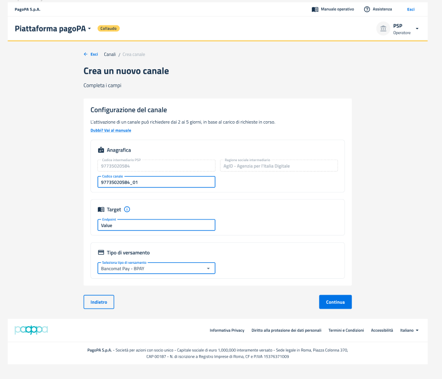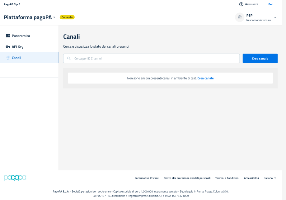 ## Sezione Canale: Creazione - Ambiente di Collaudo