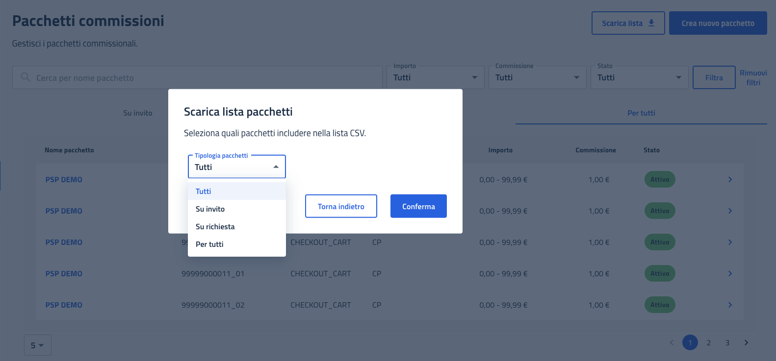 La funzionalità è accessibile direttamente dalla pagina di gestione dei pacchetti cliccando sul pulsante "Scarica lista".