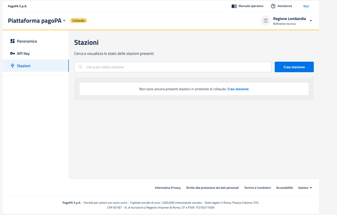 All'interno del **Back office pagoPA** in **ambiente di collaudo**,  è possibile accedere alla **sezione Stazioni** cliccando sulla **voce di menu "Stazioni"**.
