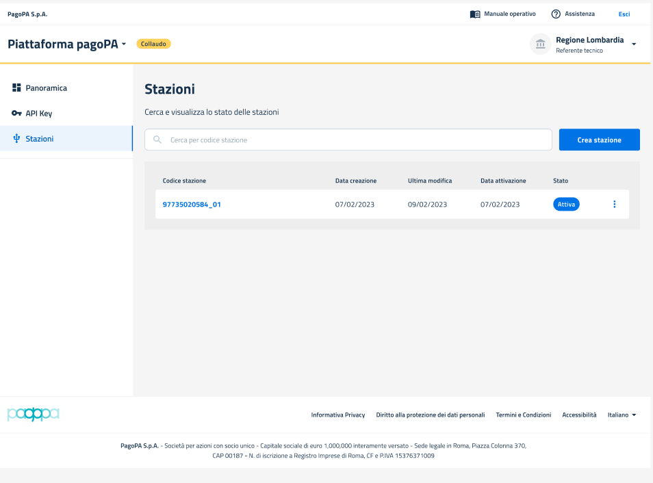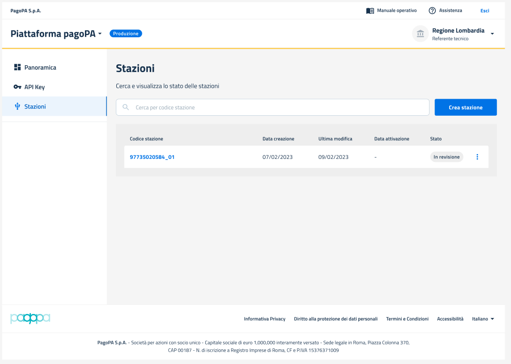* Stato: che mostra il dettaglio sullo **stato di avanzamento** del processo di creazione della stazione e può assumere il valore: "**In revisione": la stazione** è stata creata, ma in attesa di revisione da parte di PagoPA); "**Da correggere": la stazione** è stata revisionata e richiede delle correzioni; **"Attivo"** (la stazione è correttamente in esercizio).