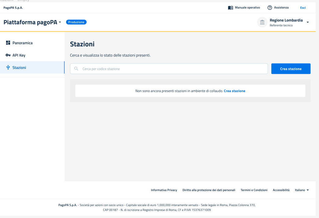 <figure><img src="https://content.gitbook.com/content/BnqUVJHM26TaVUpNXC9J/blobs/fnYgPIBsygVYFpIXFfoc/image.png" alt=""><figcaption><p><em>Pagina Lista Stazioni Prod vuota - caso in cui non sono state ancora create stazioni</em></p></figcaption></figure>