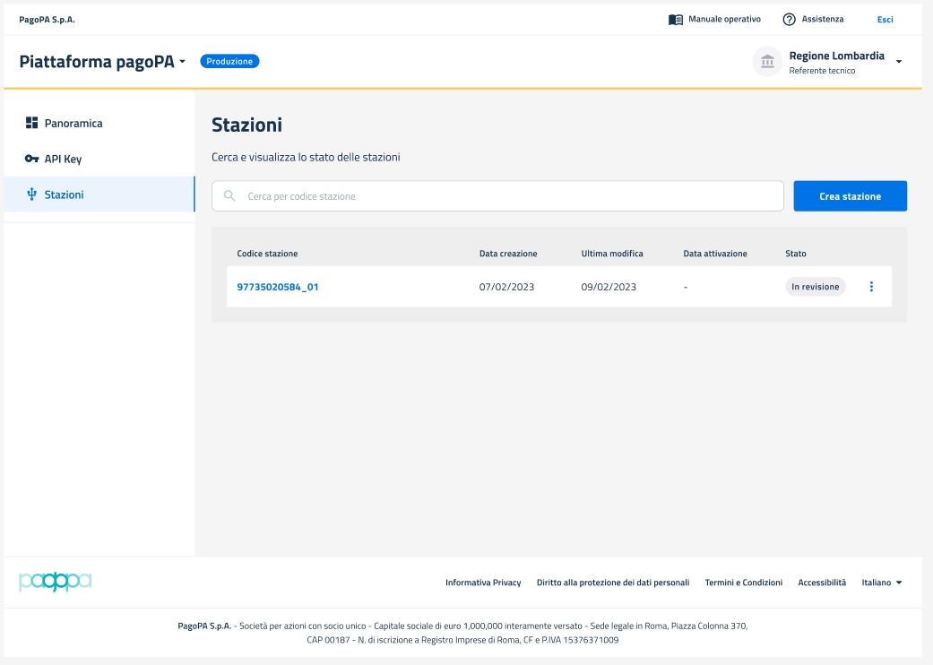 Stato: che mostra il dettaglio sullo stato di avanzamento del processo di creazione della stazione e può assumere il valore: "In revisione": la stazione è stata creata, ma in attesa di revisione da parte di PagoPA); "Da correggere": la stazione è stata revisionata e richiede delle correzioni; "Attivo" (la stazione è correttamente in esercizio).