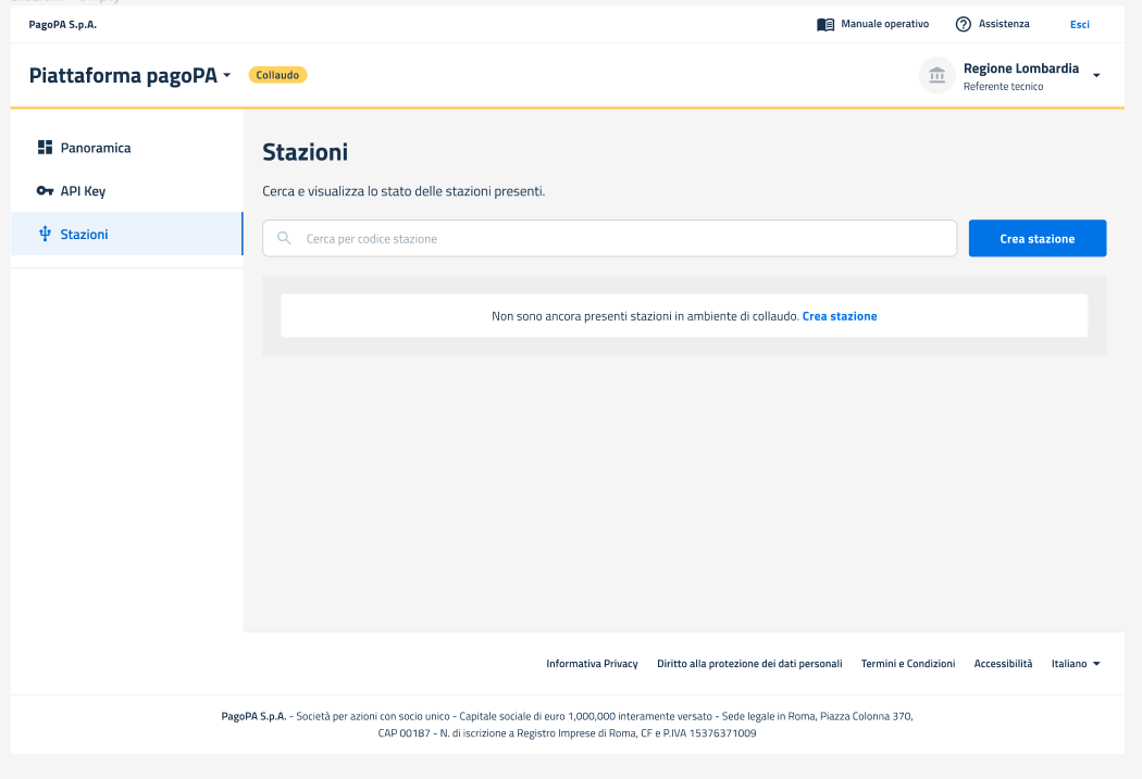 Se **non** sono ancora state **create stazioni**, l'utente visualizzerà la *Pagina "Vista Stazioni"* vuota e il warning informativo "*Non sono ancora presenti stazioni in ambiente di collaudo. Crea nuova stazione*".&#x20;