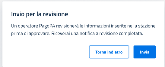 Una volta aver confermato i dati, viene mostrato un messaggio informativo in cui si comunica all'utente che cliccando sul tasto "Invia"  i dati salvati verranno inviati ad un operatore PagoPA per la revisione. Ad **approvazione avvenuta** l'utente riceverà una **notifica**.