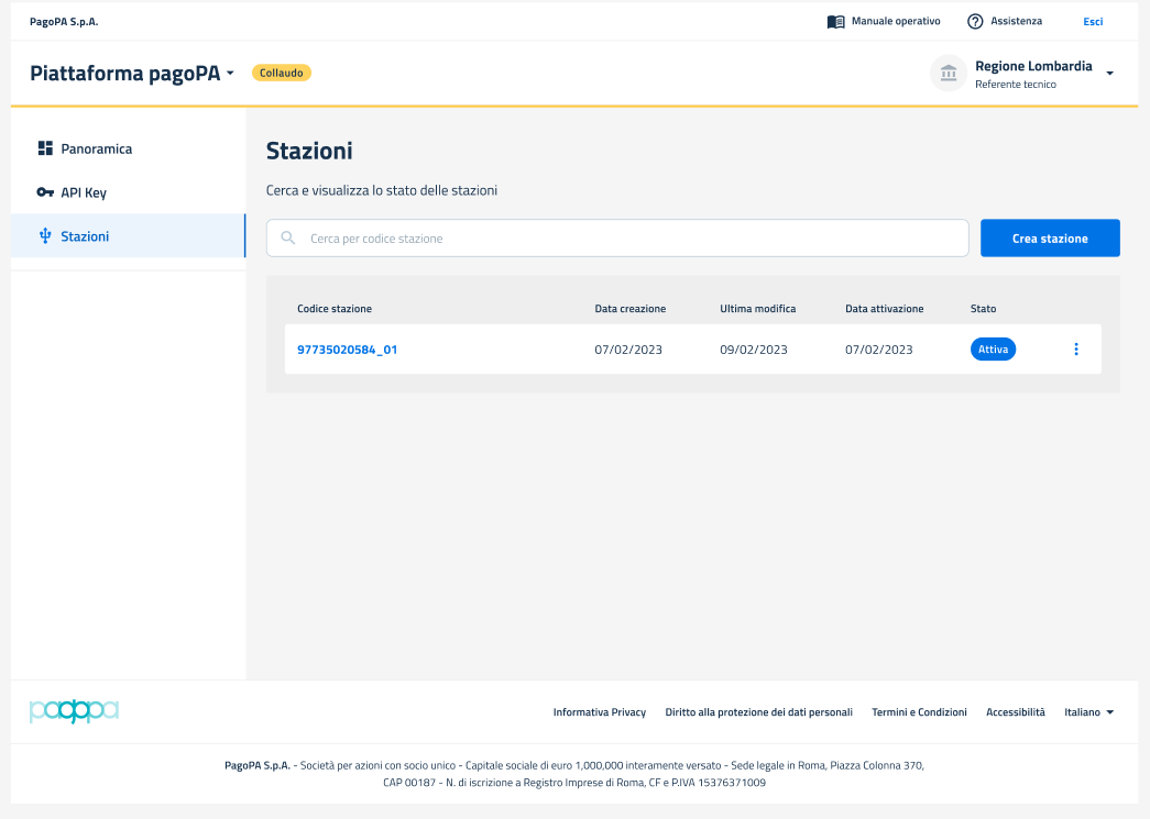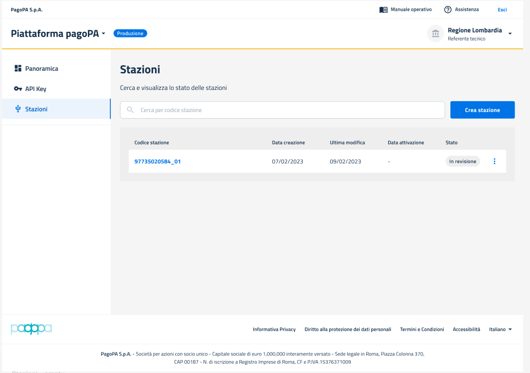 Una volta completata la revisione da parte degli Operatori PagoPA la stazione diverrà "Attiva" e potrà essere utilizzata.