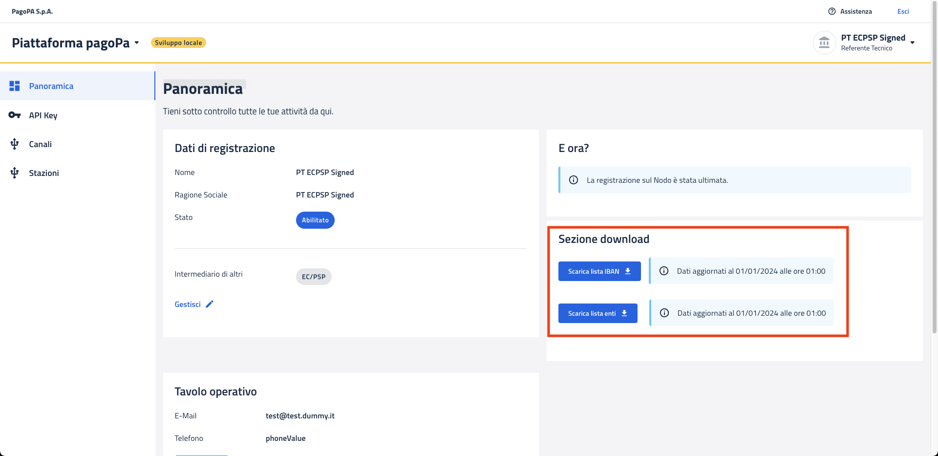 Per accedere alla funzionalità è necessario posizionarsi nella sezione "Panoramica" all'interno della quale nel riquadro "Sezione download" è visibile il pulsante "Scarica lista EC"