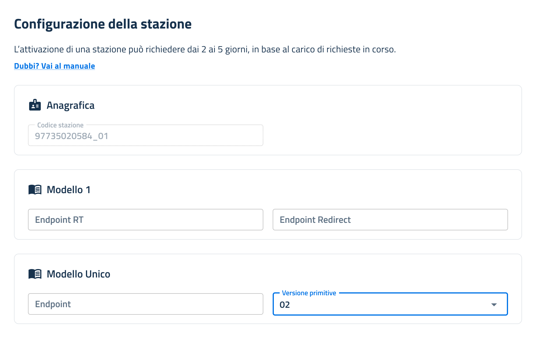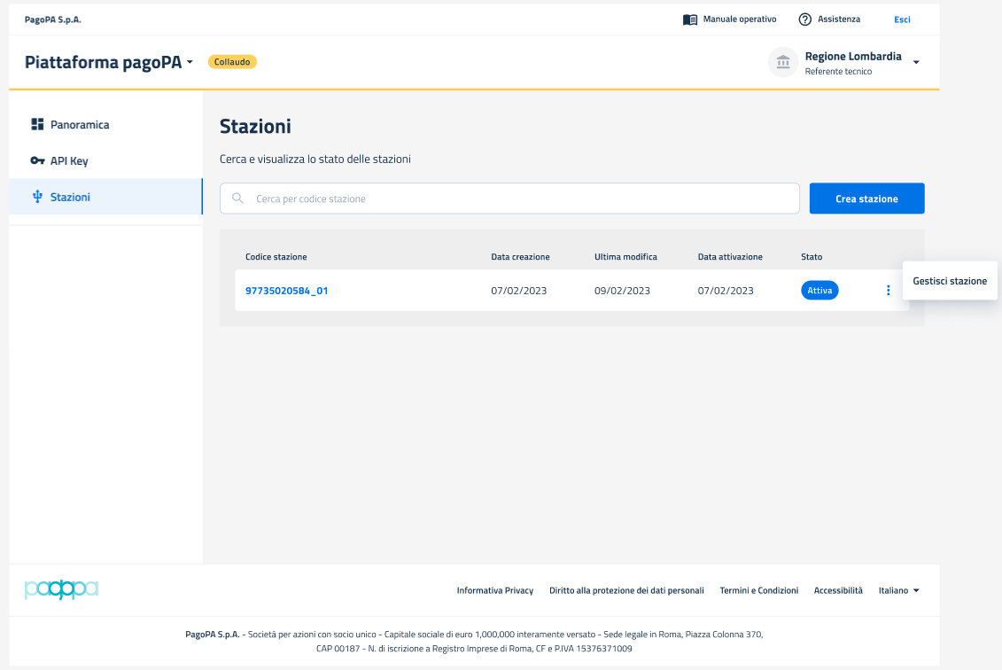 Selezionando la voce "**Gestisci Stazione**", l'utente può accedere alla Pagina di dettaglio Stazione in cui sono riportati tutti i dati di configurazione inseriti in fase di Creazione.