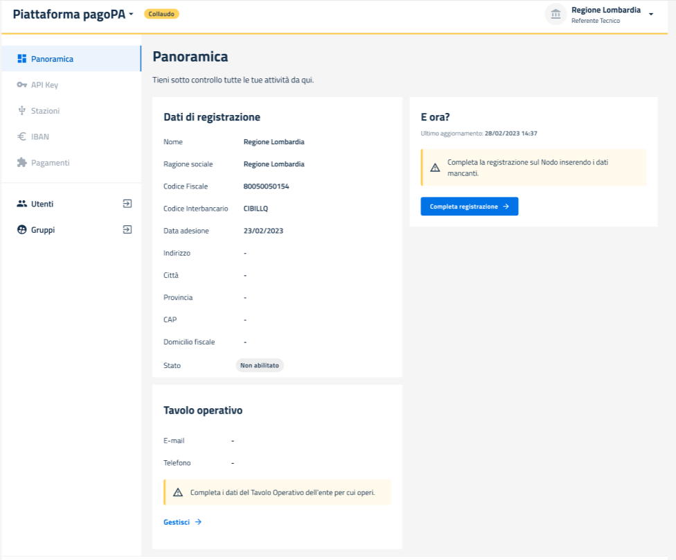 Una volta **confermata** l'operazione, l'utente **verrà reindirizzato** alla **Panoramica**, dove visualizzerà il **box "Tavolo operativo" popolato** con i dati appena inseriti.
