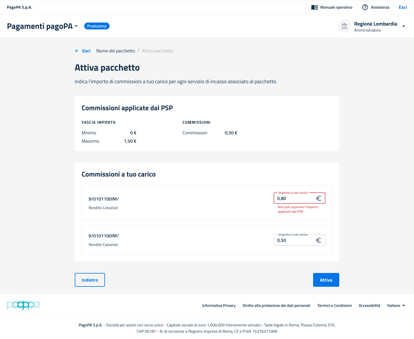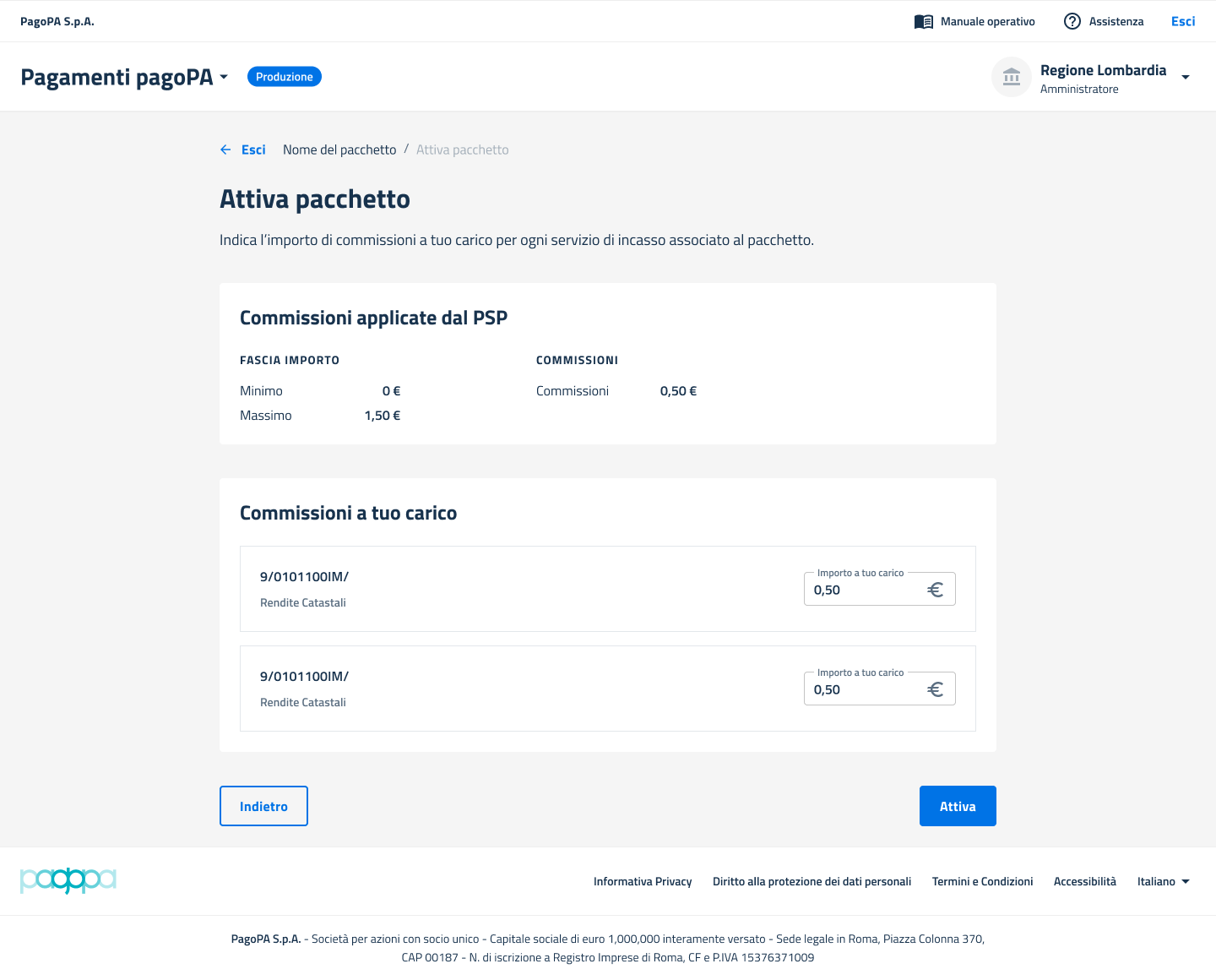 Nella maschera di attivazione è possibile visualizzare i dettagli delle commissioni applicate dai PSP.