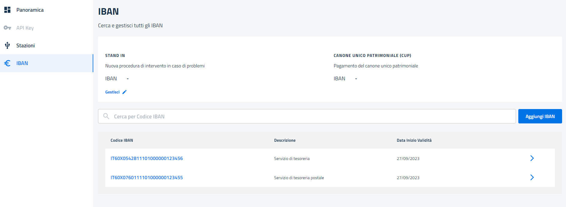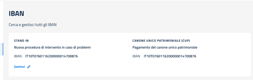 <figure><img src="https://3024316110-files.gitbook.io/~/files/v0/b/gitbook-x-prod.appspot.com/o/spaces%2FTbHElktP96kviaIsxPFs%2Fuploads%2Fgit-blob-3cff88d533ac35a314282c9dfefae1870ce2593e%2Fimage%20(11).png?alt=media" alt=""><figcaption><p><em>Gestione IBAN Stand In e Cup - Gestisci</em></p></figcaption></figure>