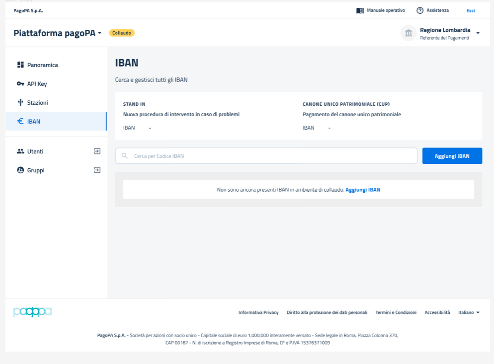 Se **non** sono ancora stati **creati IBAN**, l'utente visualizzerà la *Pagina "Vista Iban"* vuota e il warning informativo "*Non sono ancora presenti IBAN in ambiente di collaudo. Aggiungi IBAN*".