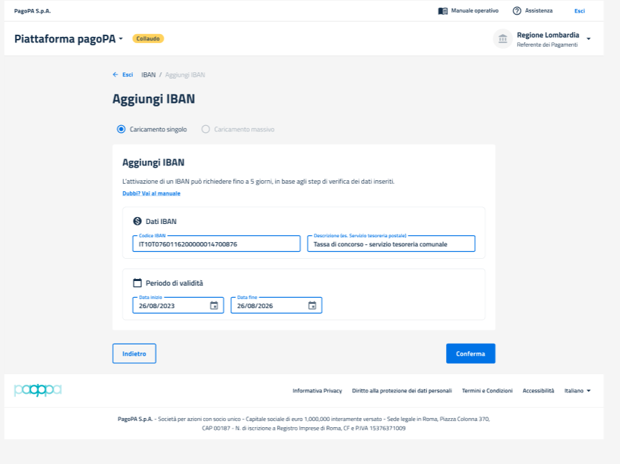<figure><img src="https://3024316110-files.gitbook.io/~/files/v0/b/gitbook-x-prod.appspot.com/o/spaces%2FTbHElktP96kviaIsxPFs%2Fuploads%2Fgit-blob-7326e4200326264204dc8e7e53c20a592c2f4e68%2Fimage%20(193).png?alt=media" alt=""><figcaption><p><em>Form Aggiungi Iban - Caricamento singolo - Conferma</em></p></figcaption></figure>