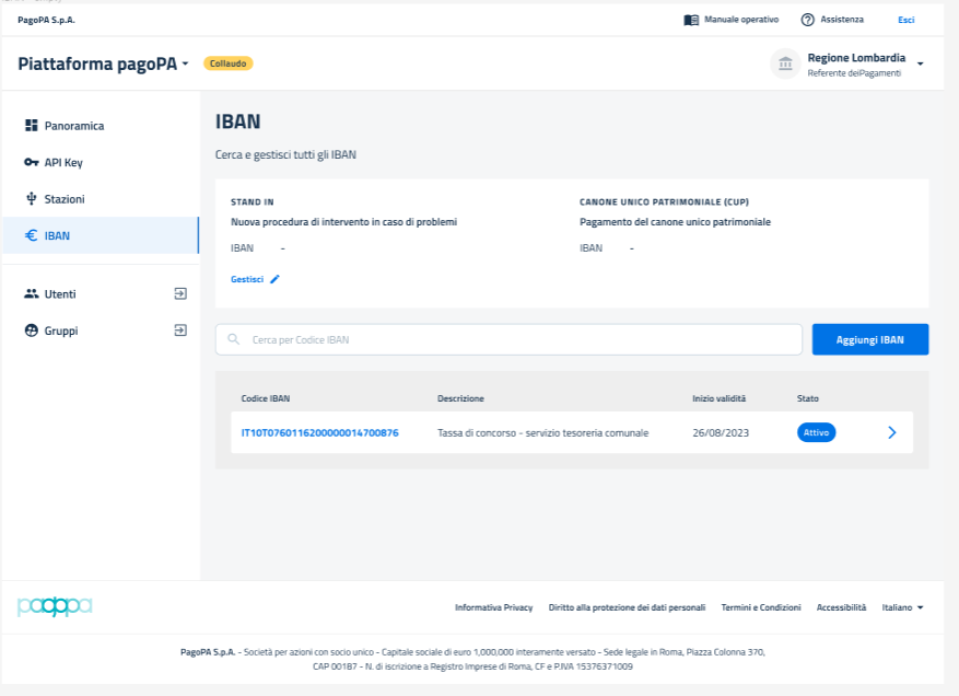 * **STAND IN:** IBAN da utilizzare per il processo che garantisce l’intervento di pagoPA qualora l’ente riscontrasse problemi. Per maggiori informazioni si faccia riferimento a <https://docs.pagopa.it/sanp/specifiche-attuative-del-nodo-dei-pagamenti-spc/funzionamento-generale/stand-in>