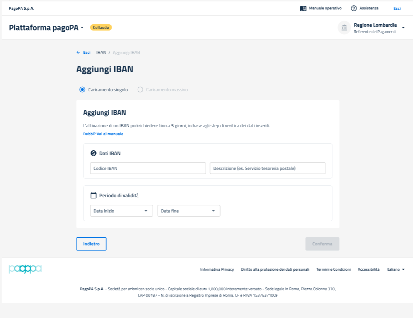 #### **Pagina Aggiungi IBAN - Caricamento singolo**