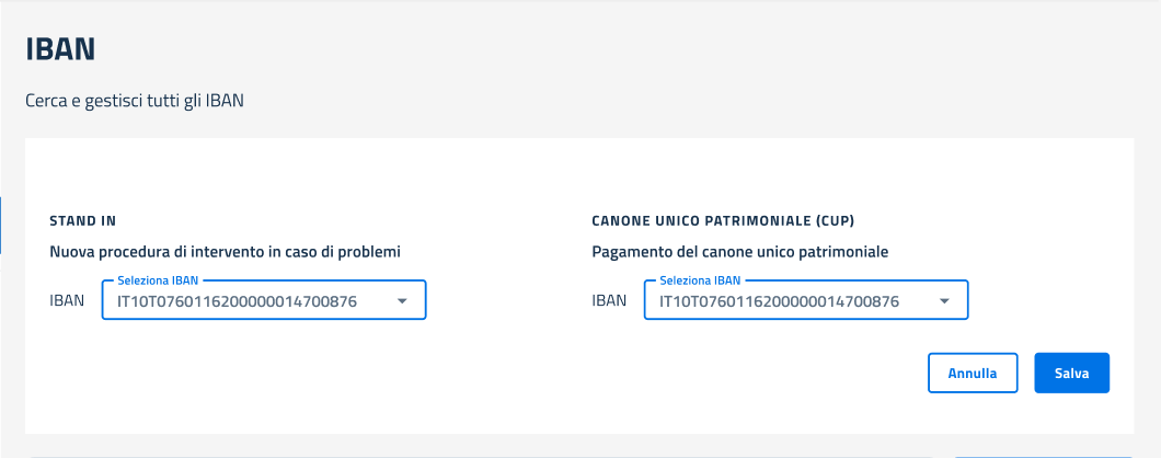 All'interno della sezione IBAN è possibile **selezionare** gli **IBAN** designati come **Stand In** e come **Cup** selezionandoli tra quelli disponibili dall'apposito menu a tendina presente nel box in alto.