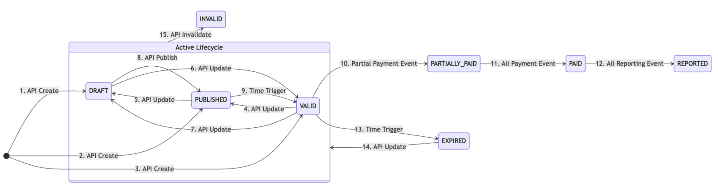 Le transizioni contrassegnate dall'etichetta API indicano operazioni invocate esplicitamente dal client. Tutte le altre transizioni avvengono automaticamente in base a logiche interne (es. scadenze temporali) o sono scatenate dal ciclo di vita del pagamento.