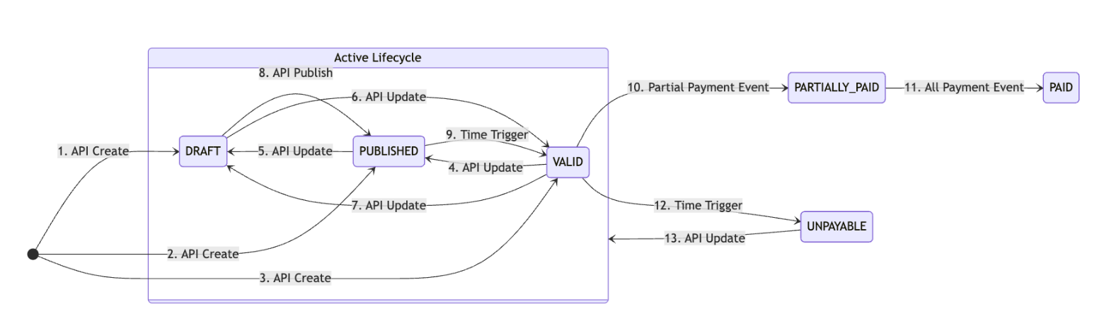 Malgrado gli stati EXPIRED e UNPAYABLE siano presenti nell’OpenAPI non esiste una transizione di stato nella versione dell’applicativo corrispondente alle SANP-3.11.0. Si riporta ugualmente il significato di questi stati.