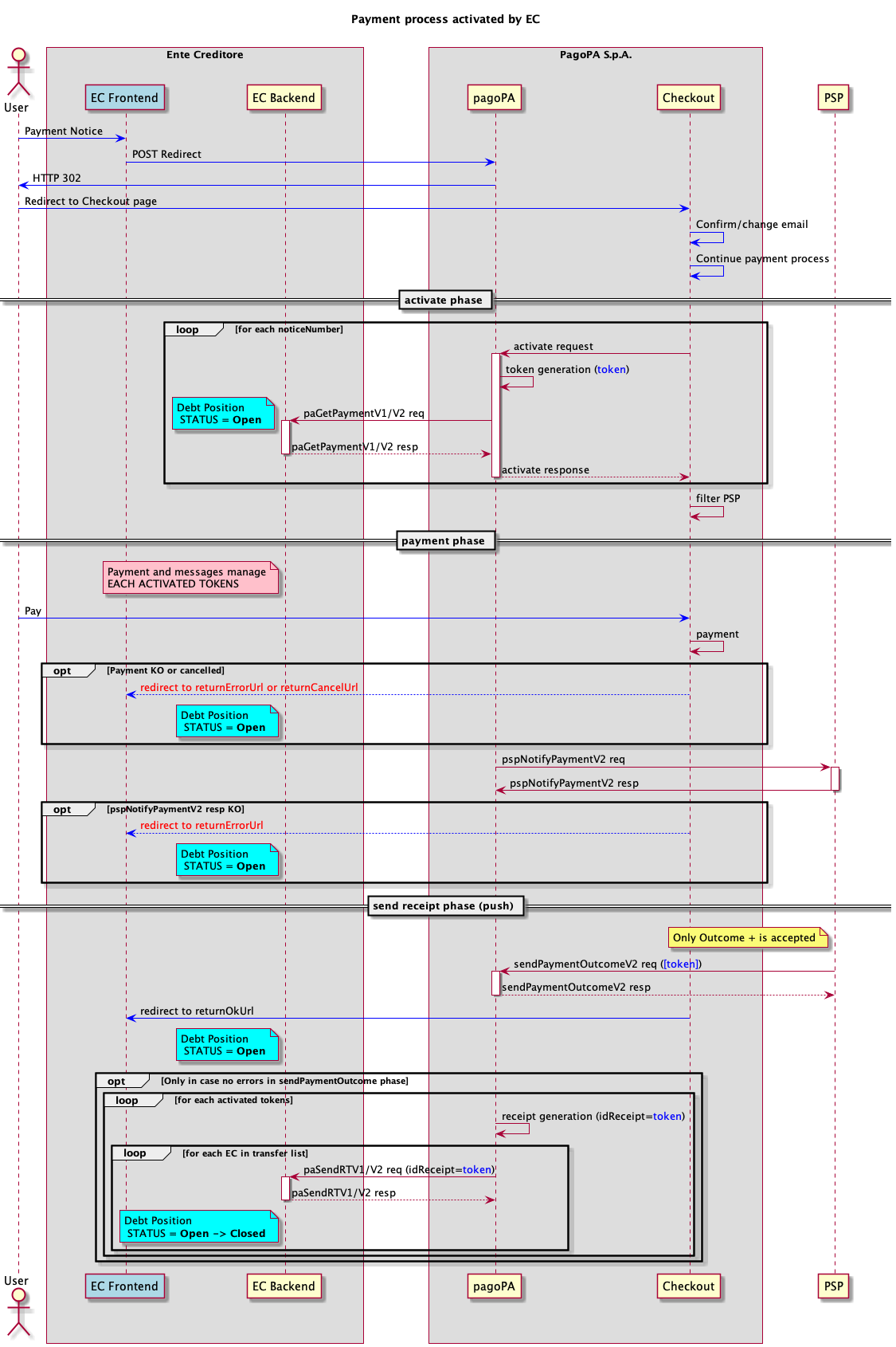 Questo processo viene attivato nel momento in cui l'operazione di pagamento è avviata dal front end di un EC, il workflow si prefigge lo scopo di aver minor impatto possibile su EC e PSP, infatti, le interfacce di comunicazione sono le stesse utilizzate per il pagamento presso i PSP, quindi ne condividono tutti i presupposti.