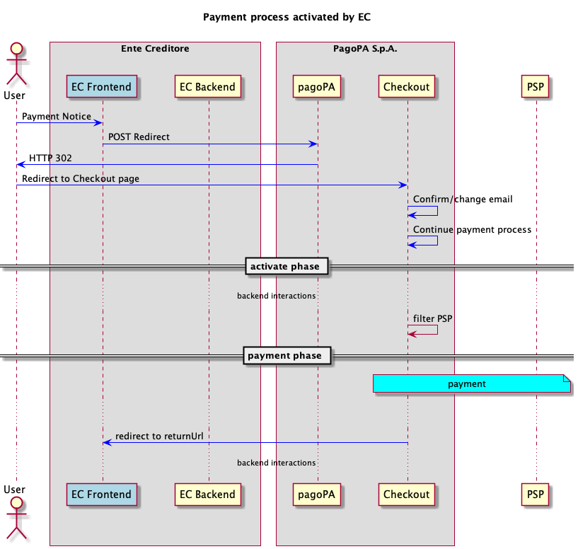 Nel caso di Pagamento presso frontend dell'EC l'integrazione con la piattaforma pagoPA avviene per mezzo di Checkout, un’applicazione web che consente ad ogni utente la navigazione degli strumenti di pagamento resi disponibili dai PSP aderenti alla piattaforma pagoPA.