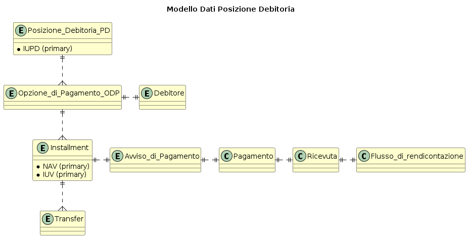 Posizione Debitoria: rappresenta l'entità padre per la quale l'EC vuole ricevere pagamenti tramite la piattaforma. Essa è identificata dallo IUPD (Identificativo Unico Posizione Debitoria) ed è così composta: